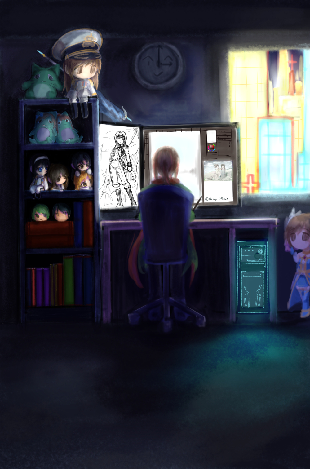 불이 꺼진 방에서 빛나는 모니터, 그리고 창가 너머의 도시 야경, 어딘지 쓸쓸해보이는 주인공, 그리고 그런 주인공을 바라보는 살아있는 것만 같은 인형들